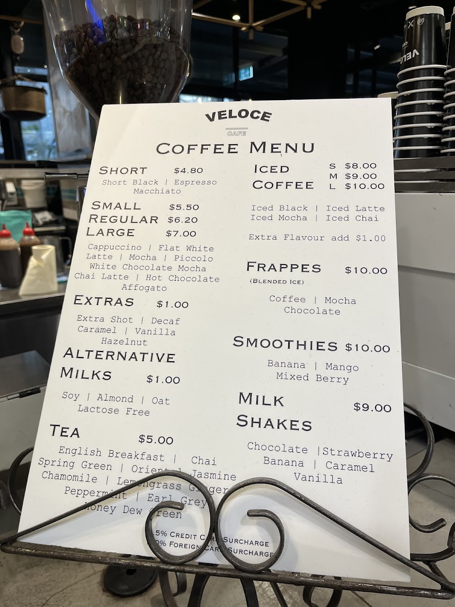The menu at Veloce focuses on a variety of coffee options, including both caffeinated and decaffeinated beverages, suitable for coffee breaks or casual visits. Alongside drinks, the menu offers light food items and snacks, which complement the beverage selections.